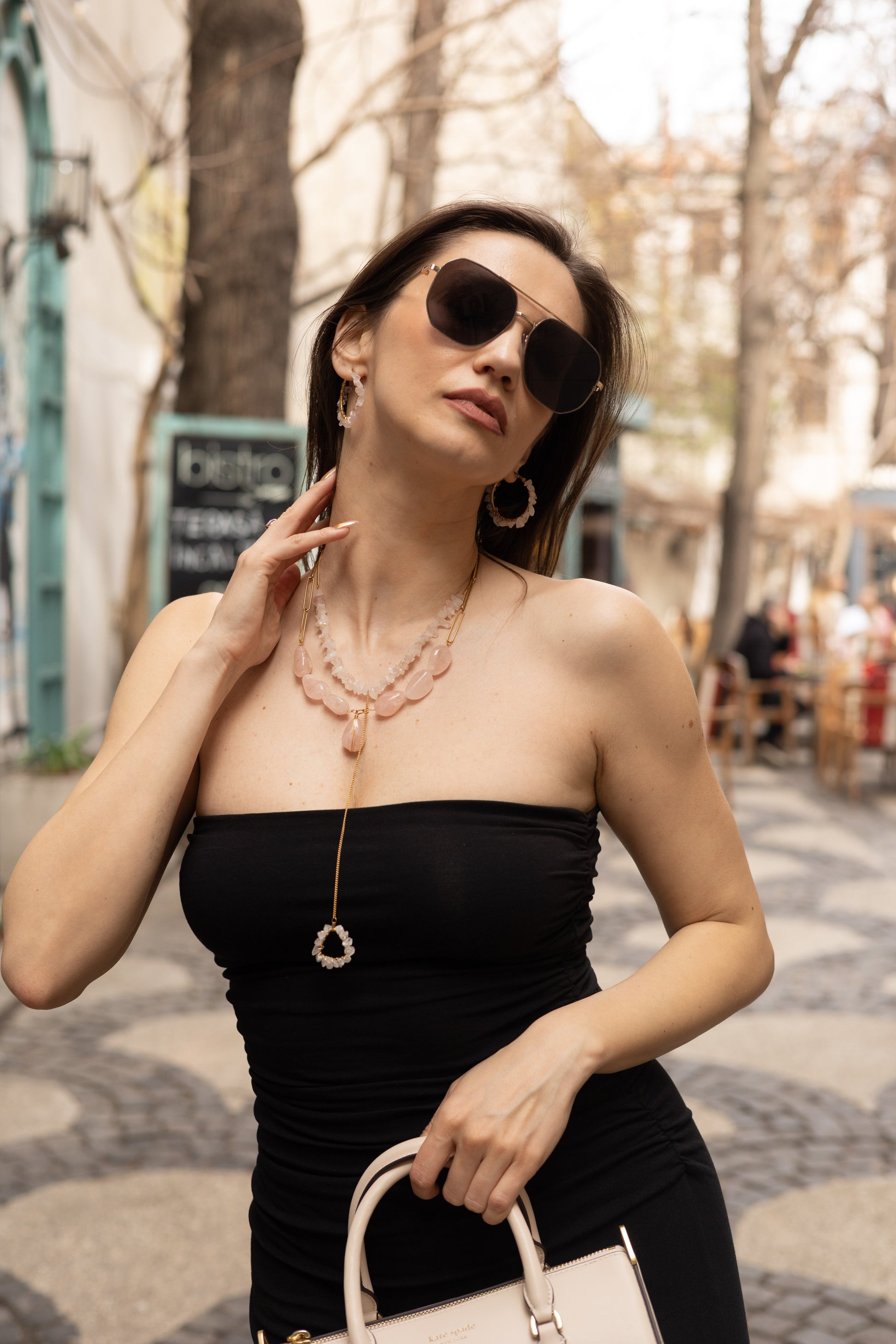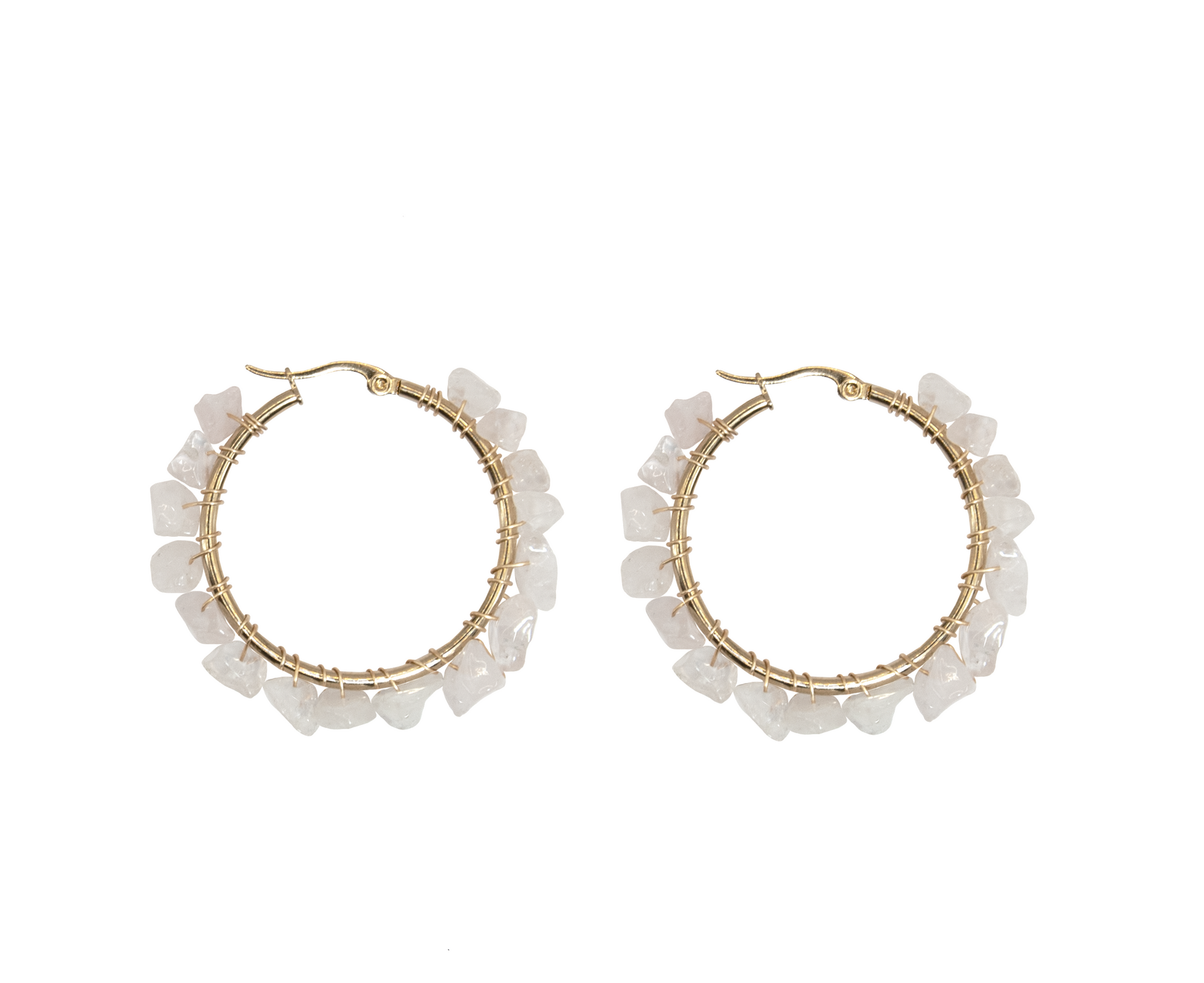Cercei din pietre otel inoxidabil placat cu aur 18k si pietre naturale Quartz roz.