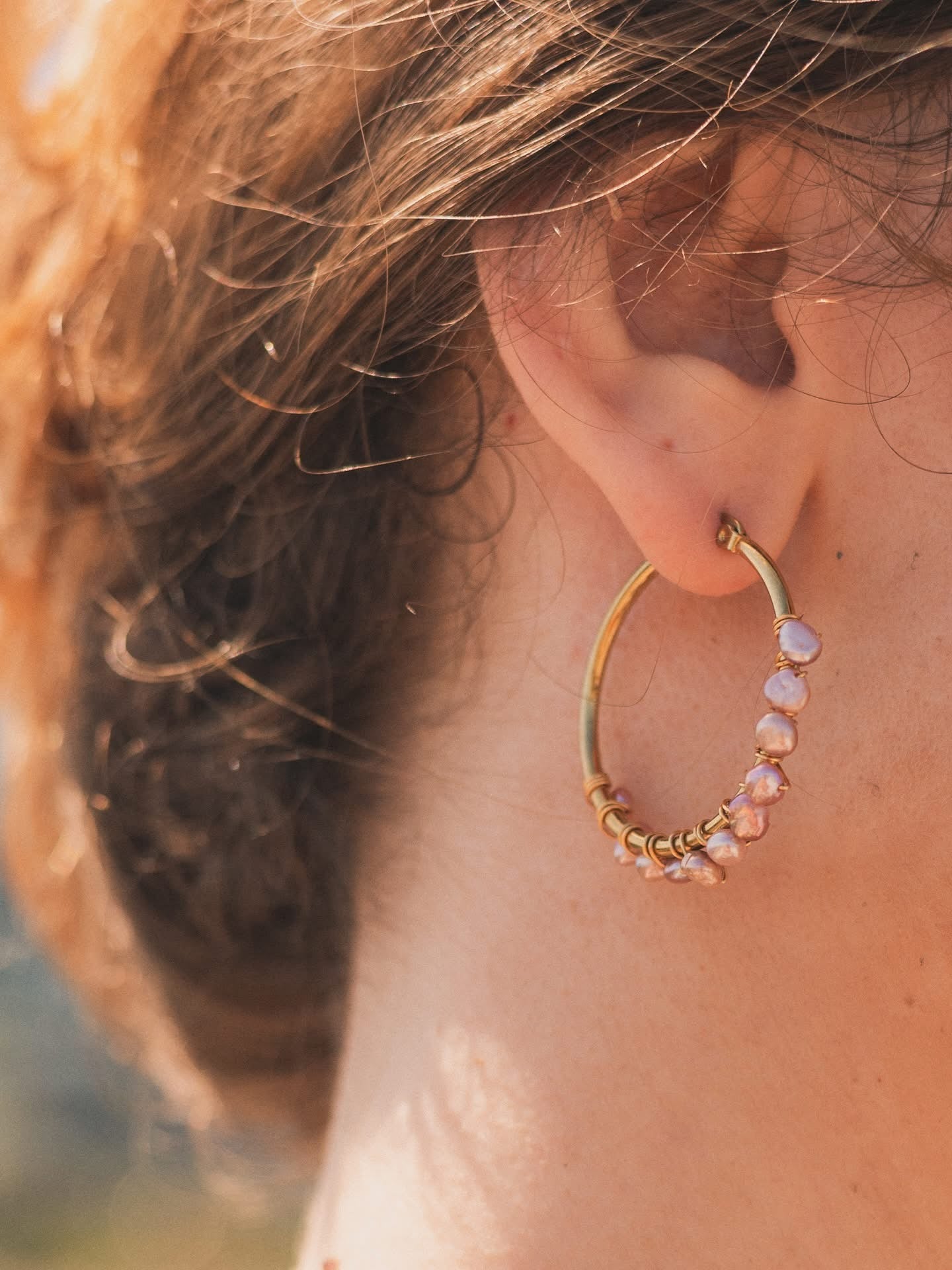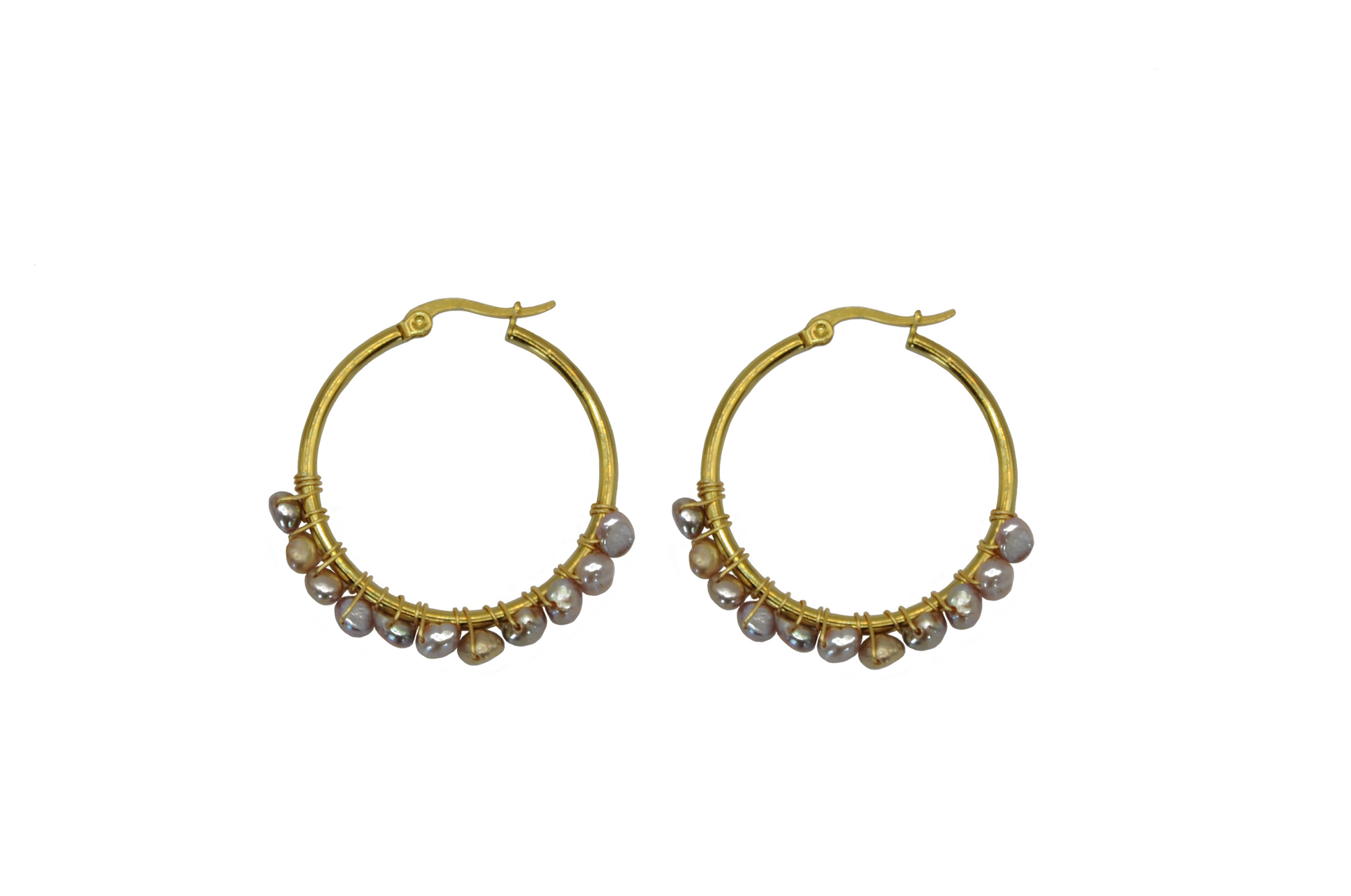 Cercei din oțel inoxidabil placat cu aur de 18k, cu perle de cultură mici, în nuanțe mov-albastre.