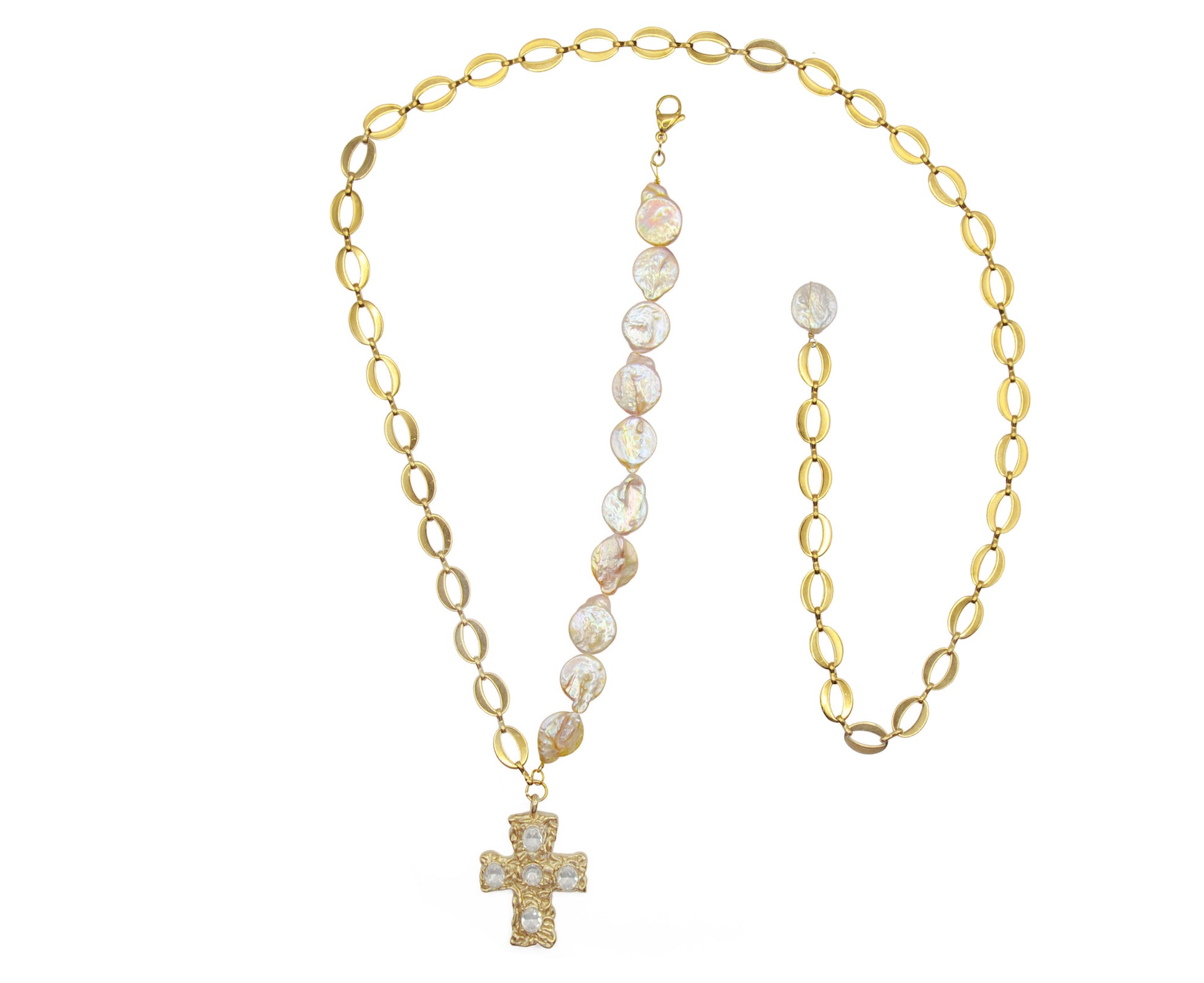 Colier realizat manual din perle naturale baroc, cruce din oțel inoxidabil placat cu aur 18K și lanț din oțel inoxidabil placat cu aur 18K