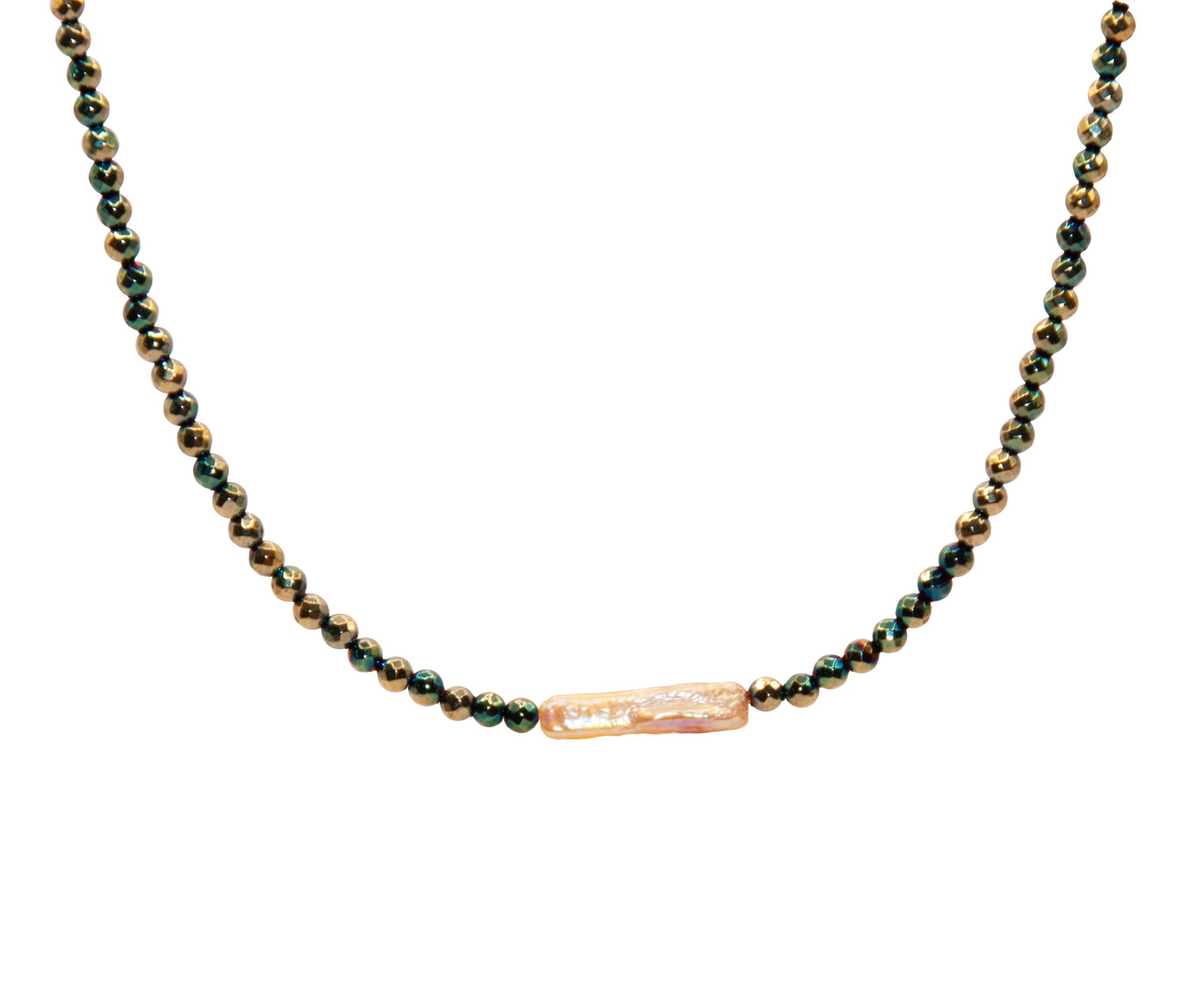 Colier realizat manual din pietre naturale hematit electroplacat, perla naturală baroc și oțel inoxidabil placat cu aur 18K