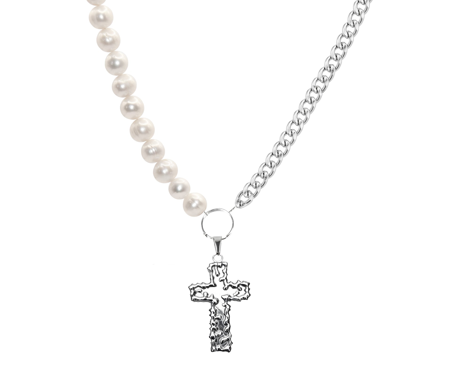 Colier realizat manual din perle de cultură albe, oțel inoxidabil și cruce din oțel inoxidabil