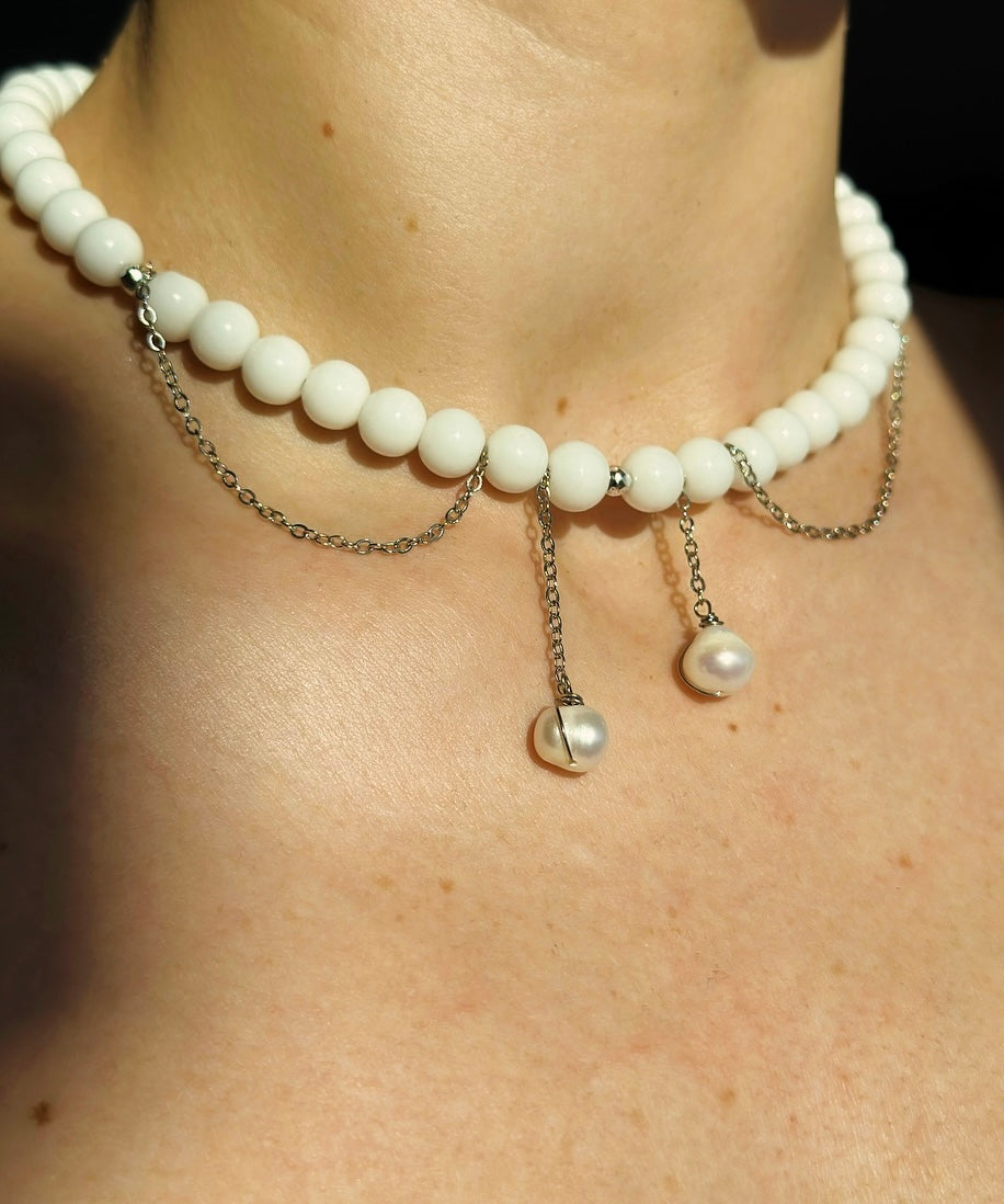 Colier din onyx alb natural, hematit si perle de cultura