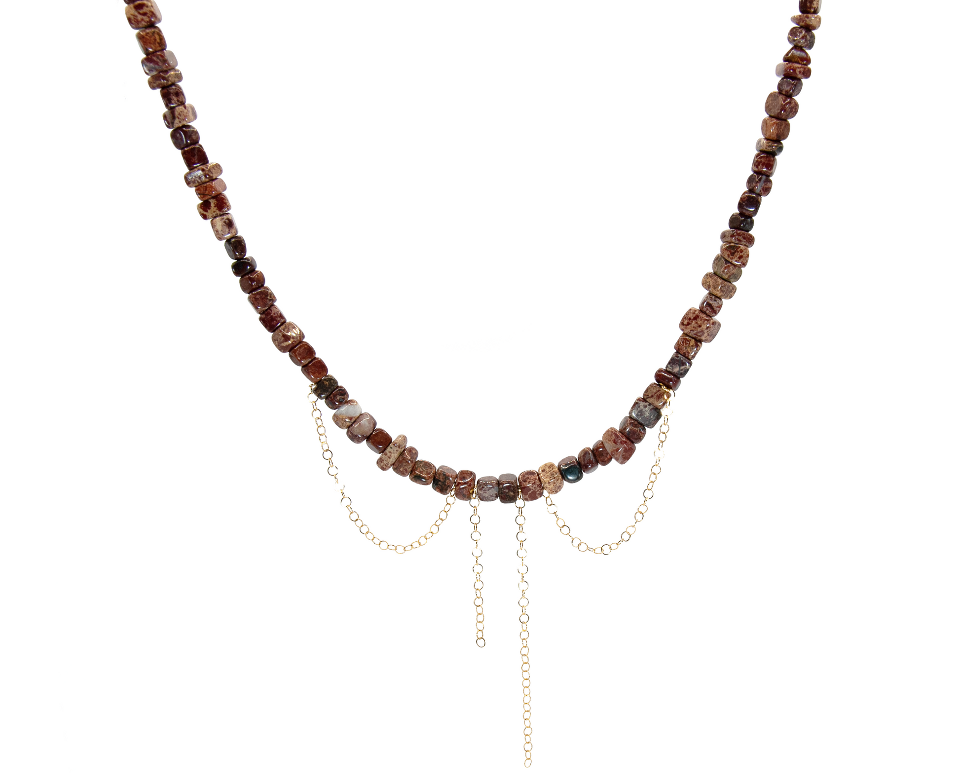 Colier realizat manual din pietre naturale de Jasp, combinat cu un lanț delicat din oțel inoxidabil placat cu aur de 18K. Pietrele își păstrează frumusețea naturală, fiecare având nuanțe și detalii unice, ceea ce face ca fiecare colier să fie deosebit.