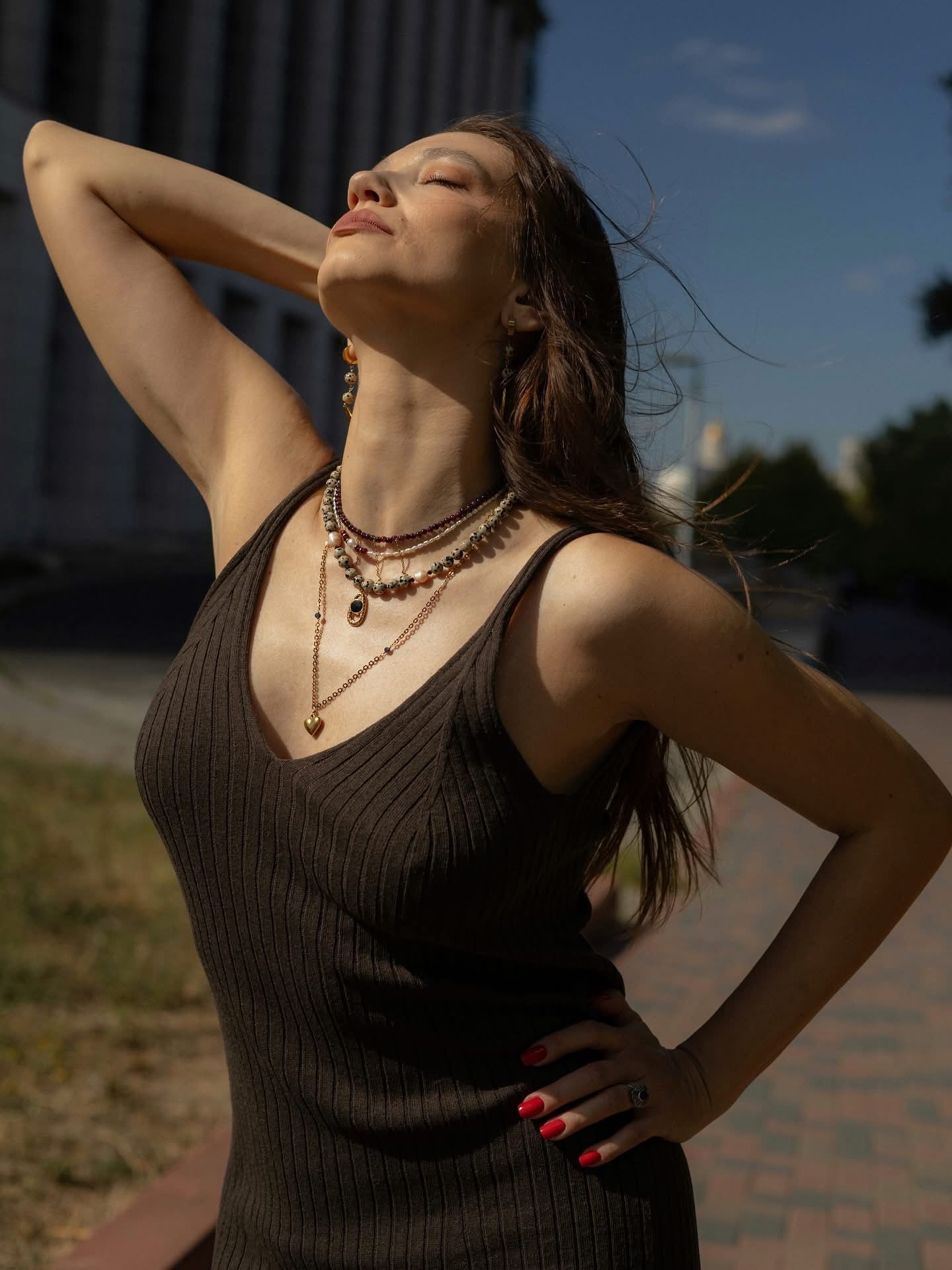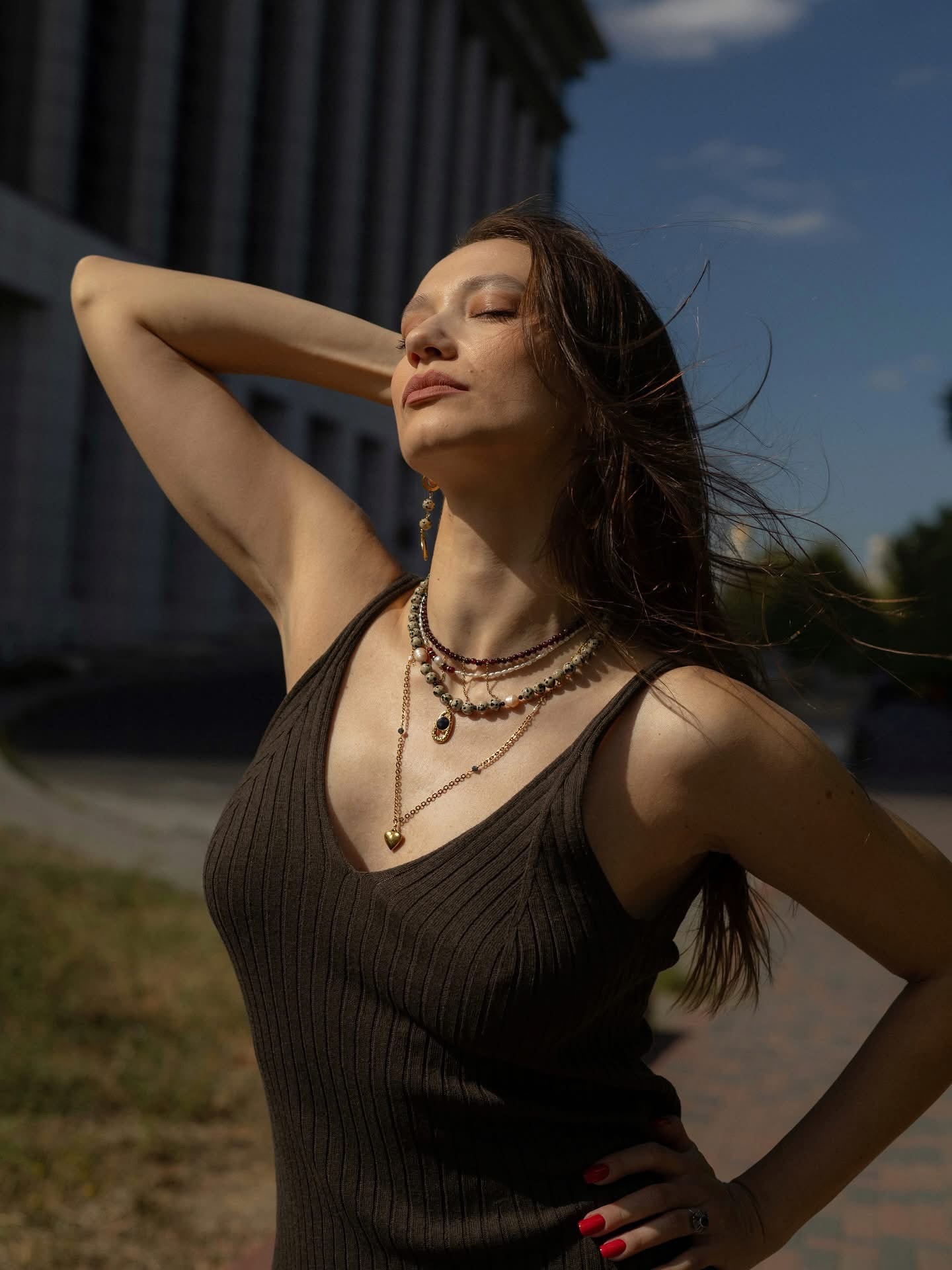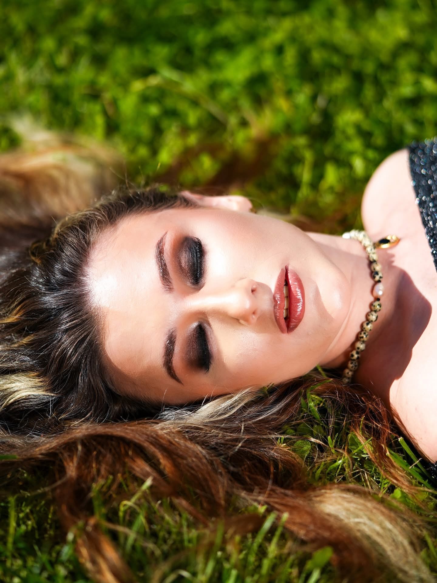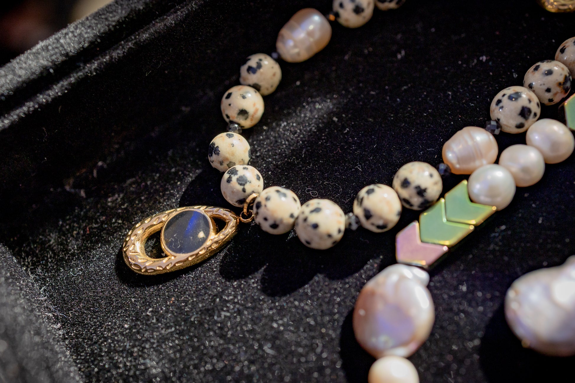 Colier din pietre naturale jasp dalmatian, perle de cultura roz, spinel negru si pandantiv din otel inoxidabil placat cu aur 18k.