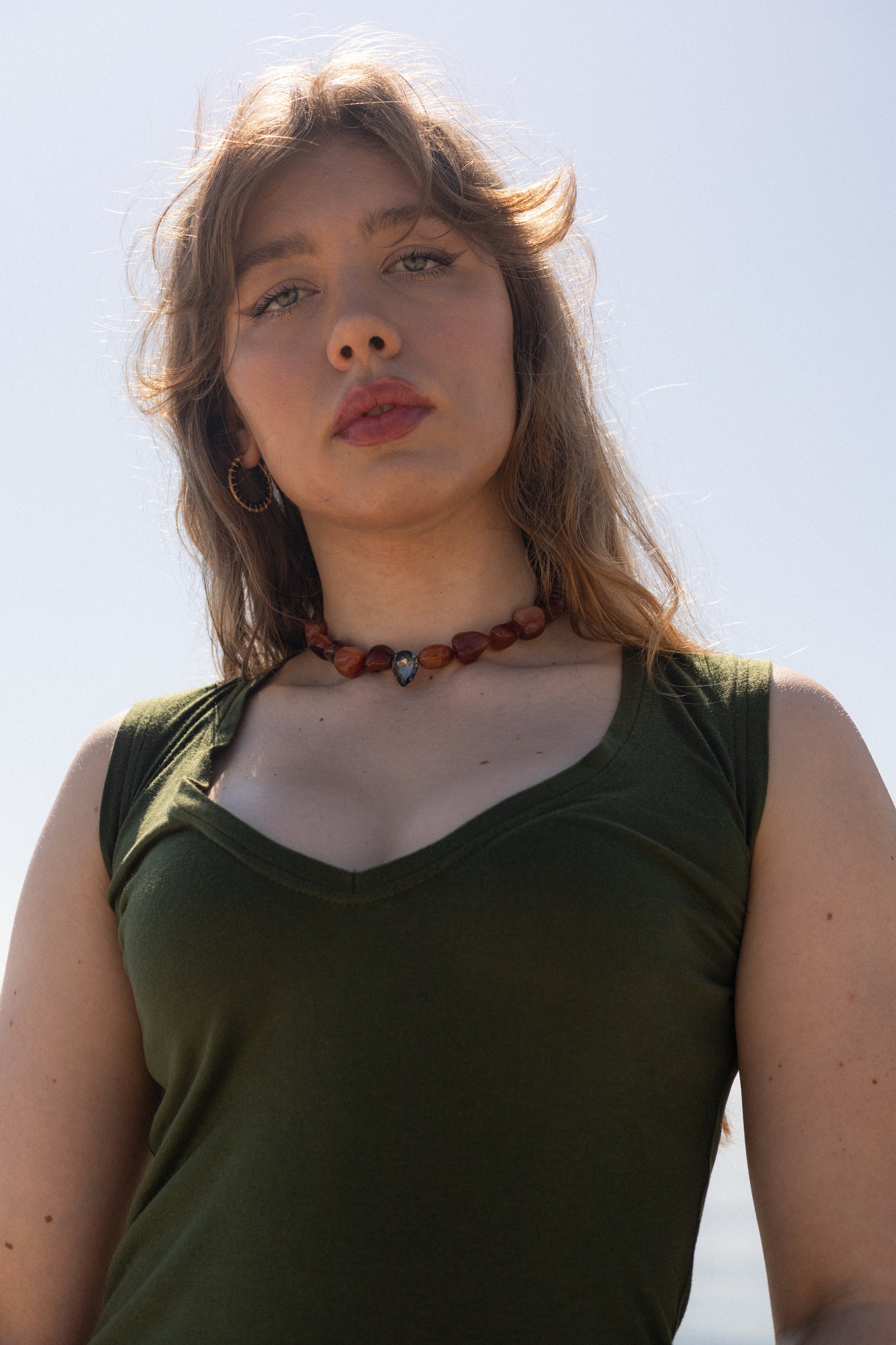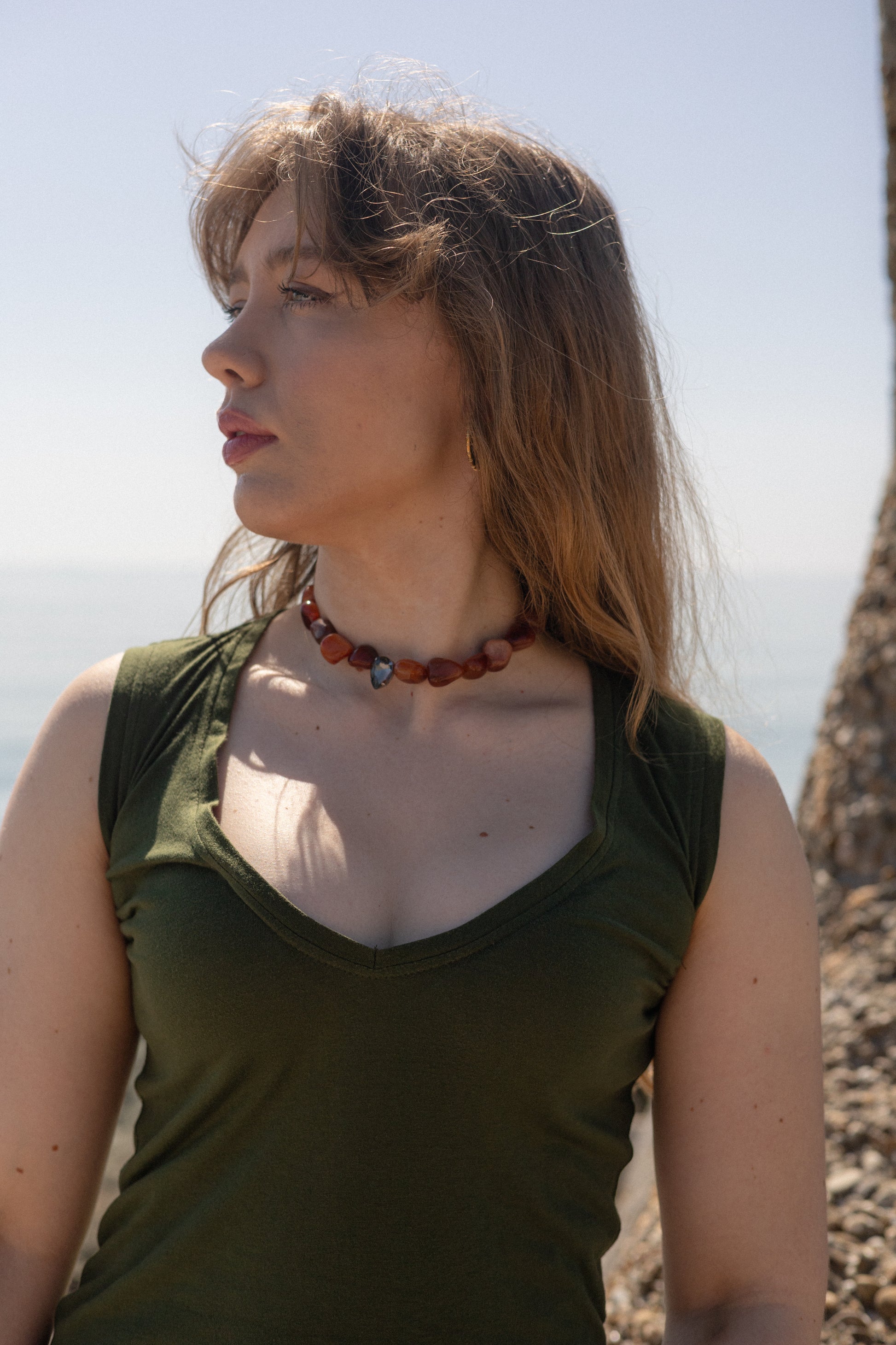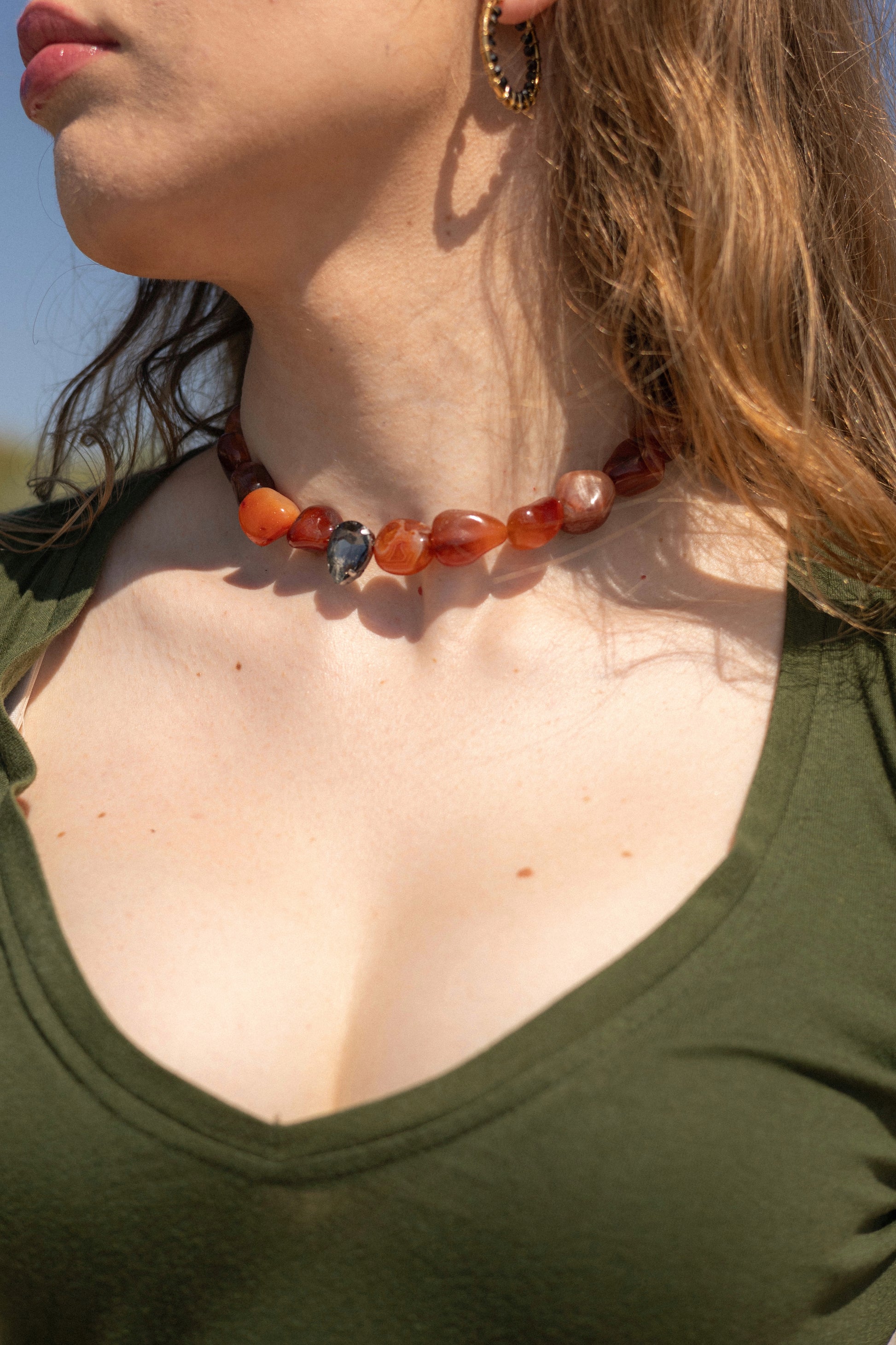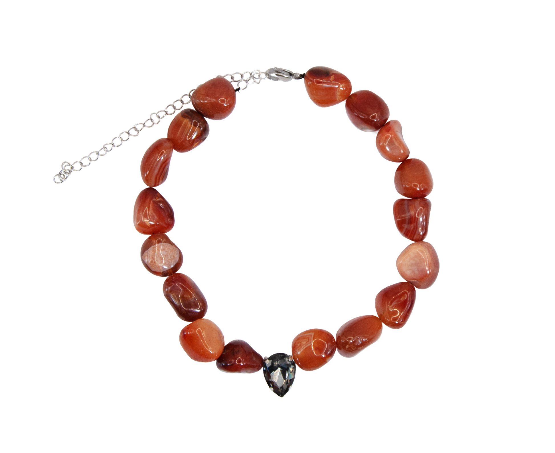 Colier la baza gatului din pietre naturale Agate si cristal din sticla in montura din otel inoxidabil