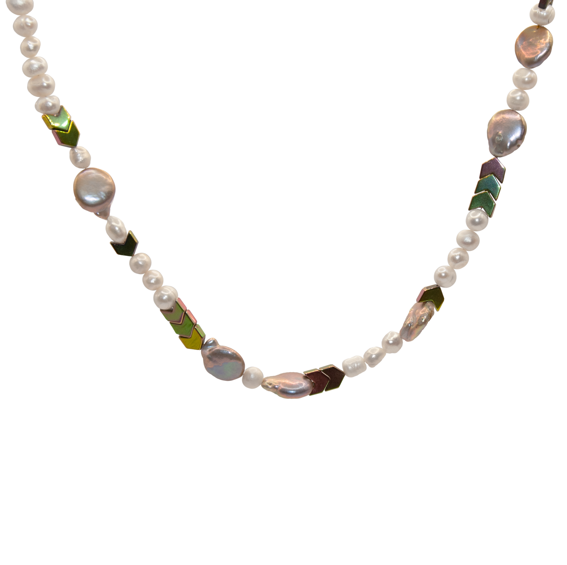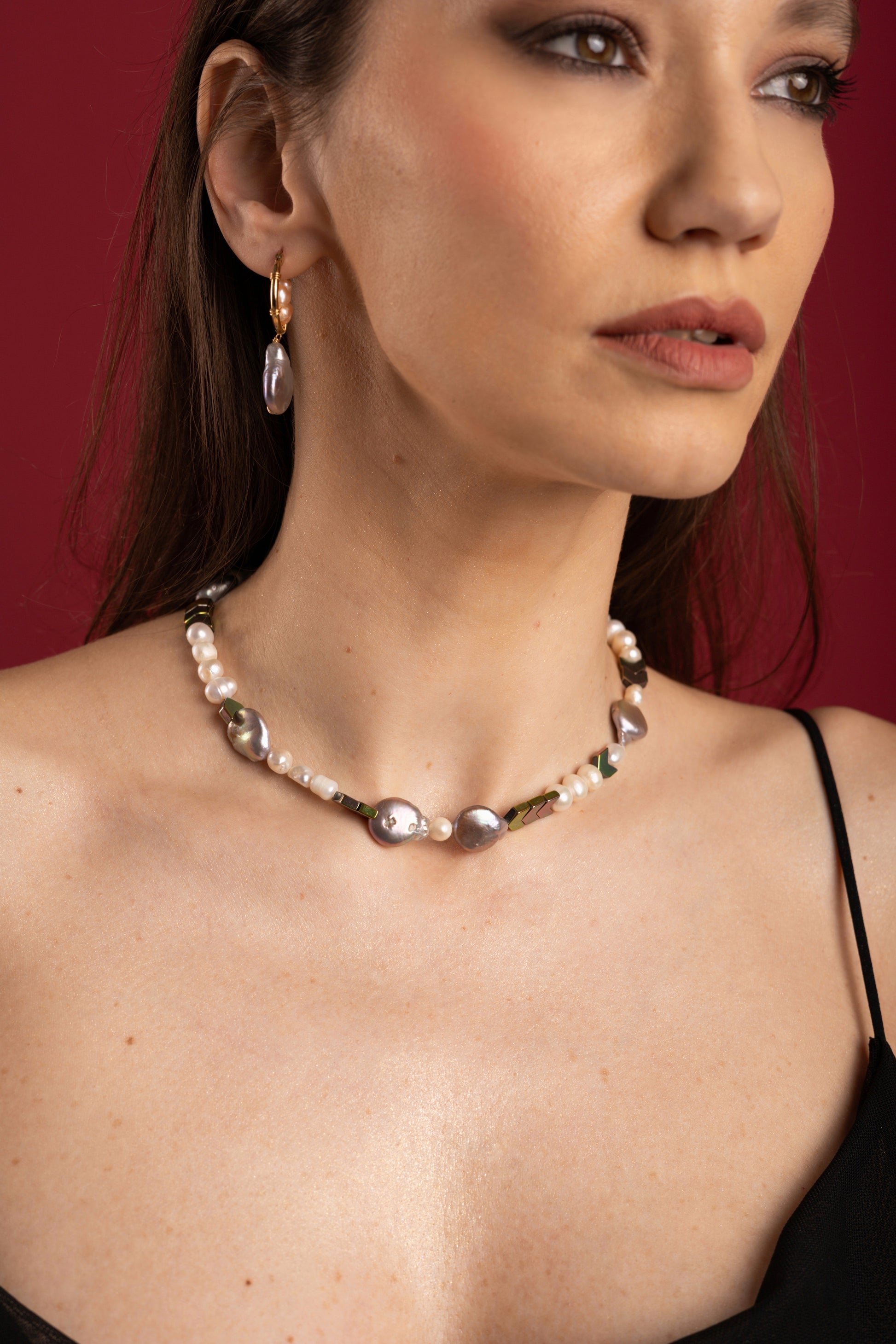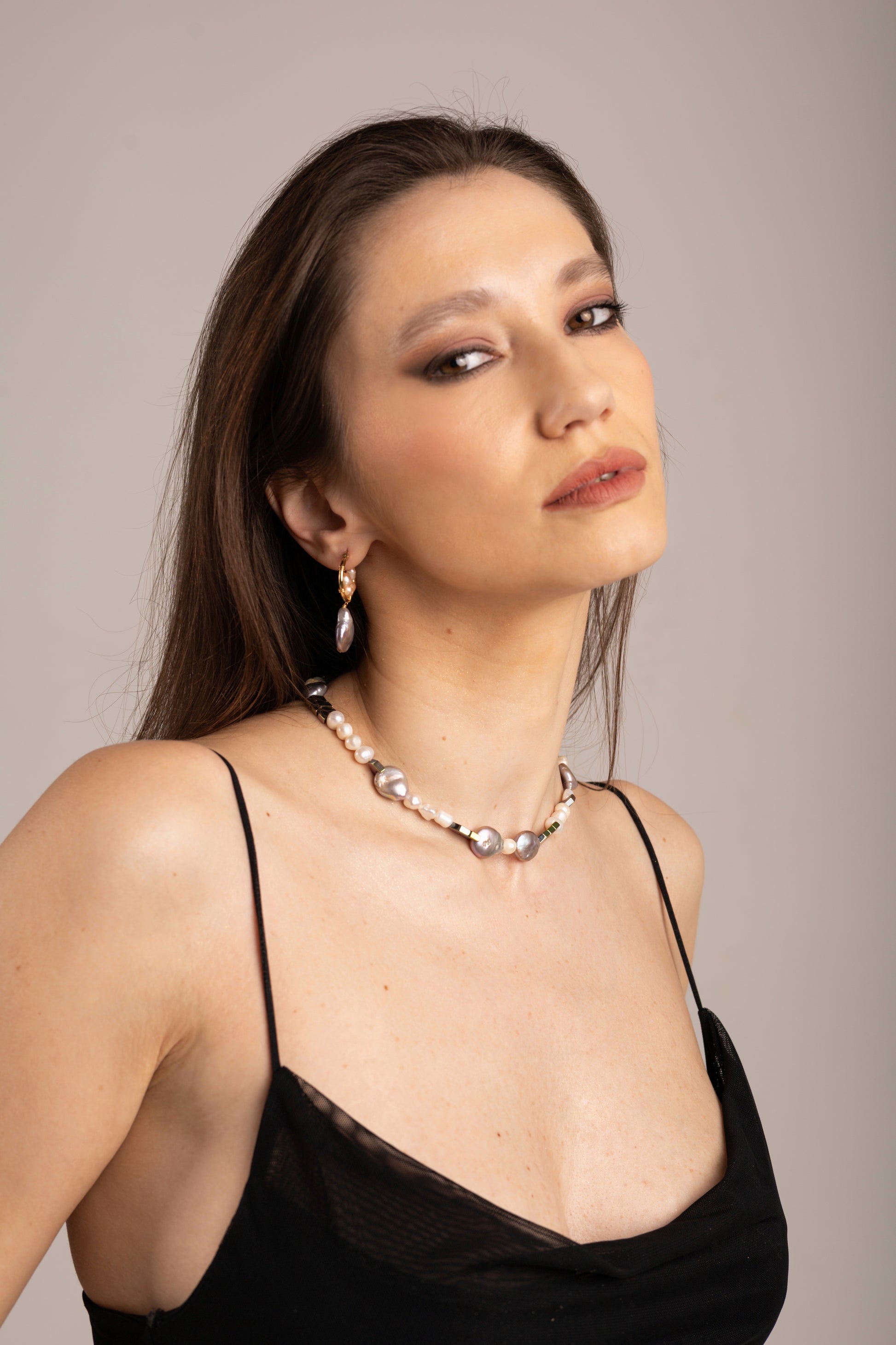 Colier realizat manual din perle naturale de cultură, perle naturale baroc, pietre naturale Hematit electroplacat, oțel inoxidabil placat cu aur 18K