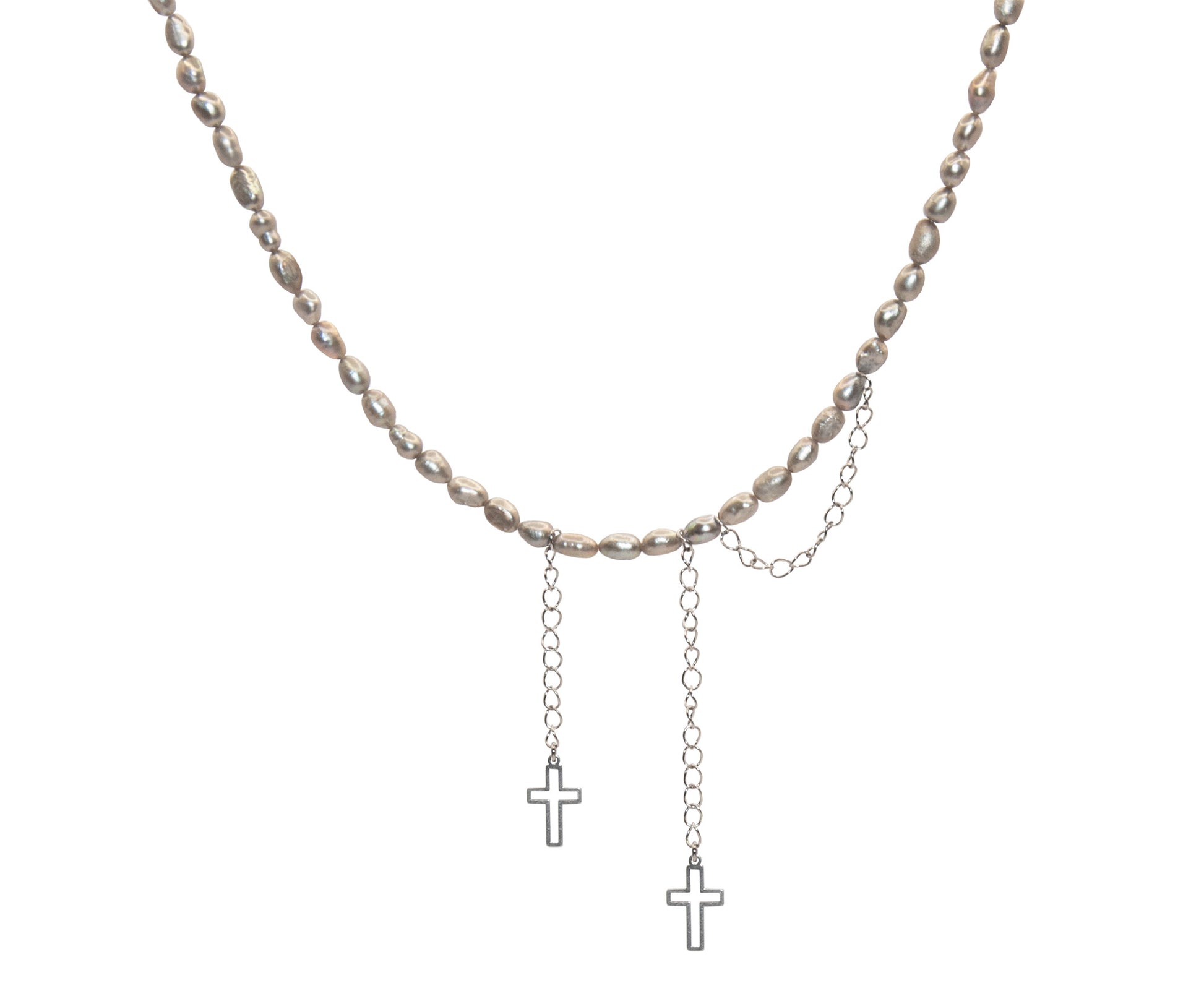 Colier realizat manual din perle de cultură gri, lanț din oțel inoxidabil și cruci din oțel inoxidabil